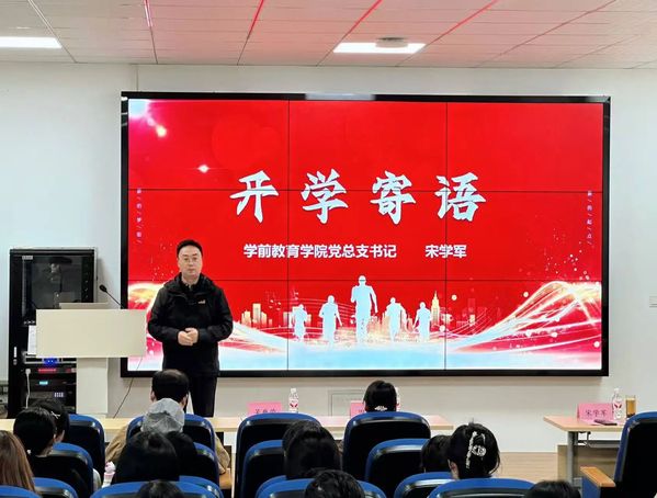 学前教育学院党总支书记宋学军为新生开启大学第一课。他提出四点建议:一是坚持学习第一要务,科学规划大学路径,兼顾专业学习与综合素质培养;二是学会独立生活、主动解决问题、善用各类资源;三是重视运动与健康,保持积极向上的心态;四是严守规章制度,明确成人责任,不触碰纪律底线。