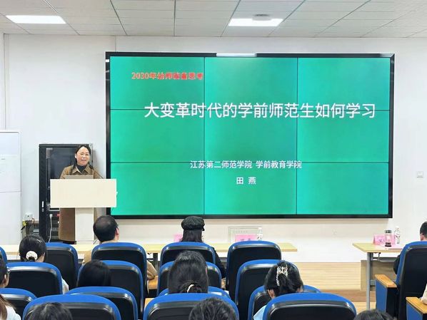 院长田燕为全体新生带来开学第一课。她首先介绍了学院基本情况:学前教育学院办学经验丰富、师资团队优异、文化内涵深厚,是培养江苏省学前教育师资的重要基地。建院以来,已培养数千名优秀幼教人才,遍布江苏各地幼儿园。