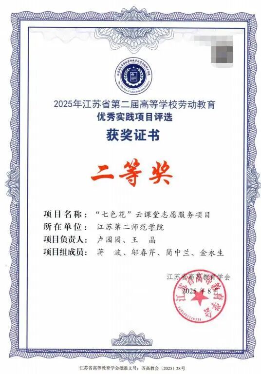颁奖环节,崇德书院“七色花”云课堂志愿服务项目荣获2025年江苏省第二届高等学校劳动教育优秀实践项目评选二等奖。这一荣誉是对书院劳动教育创新成果与志愿服务实践的充分肯定,彰显了崇德学子以劳育德、以行践知的责任担当与青春风采。同时,书院多名同学和带队老师荣获校级优秀团体及个人称号,展现了崇德学子积极进取、笃行不怠的精神风貌。