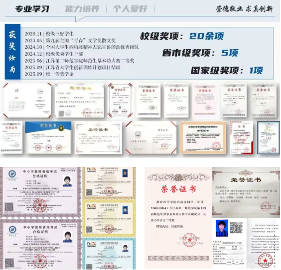 在精进学业的同时,她高效规划职业发展路径,分别通过小学语文和初中语文教师资格考试、英语六级、计算机三级及家庭教育指导师认证。立志未来从事教师事业的她,亦注重教学实践能力的培养,曾获校师范生基本功大赛二等奖、学院“山香杯”微课大赛三等奖,以赛促学,在不断的演练与反思中锤炼从师技能,夯实专业根基。