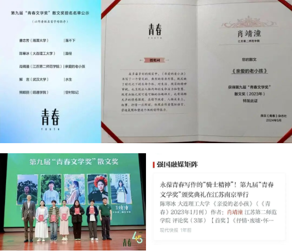 人民教师、鲁迅文学奖得主庞余亮先生曾说,“人要学会用写作雕刻自己,而一位好教师,正是在这样的雕琢中一点点成长起来的”。在文学创作这座“看不见的讲台”上,肖靖潼同样耕耘不辍。她深信“文学是师范生课堂的延伸”,始终尝试以笔尖记录文化、探索历史、歌颂师道、刻画亲情。2024年,她的散文作品《亲爱的老小孩》荣获第九届“青春”文学奖散文奖,并被学习强国、中新网、新浪网等多家主流媒体关注报道。此有纪实类作品《以理想为舟》、《播种希望的人》等发表于《中国文艺家·少年文艺家》,另有《补习班拾遗》载于《莫愁·小作家》,《张渤治水》载于《云游宜兴》。