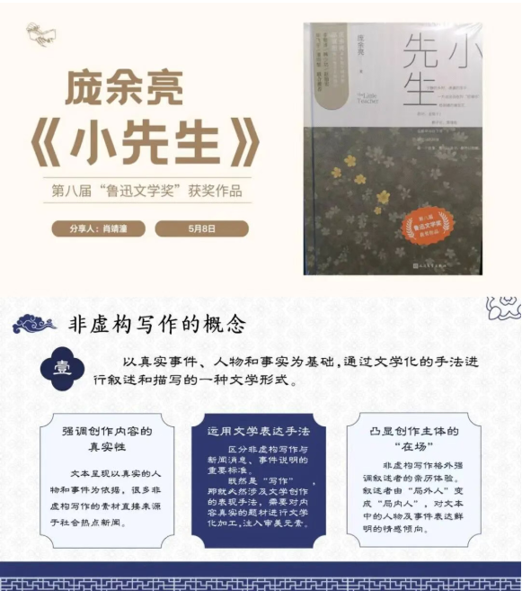 作为中国散文学会会员,她亦积极将创作所获反哺师范生群体,曾在书院“夏日渐醒·以书慧心”阅读分享活动中,作为代表分享《小先生》作品阅读心得及非虚构写作方法,以自身实践诠释“如何用文字捕捉教育现场的微光与温情”,借助文学作品为学弟学妹们提供可感可循的创作范本。