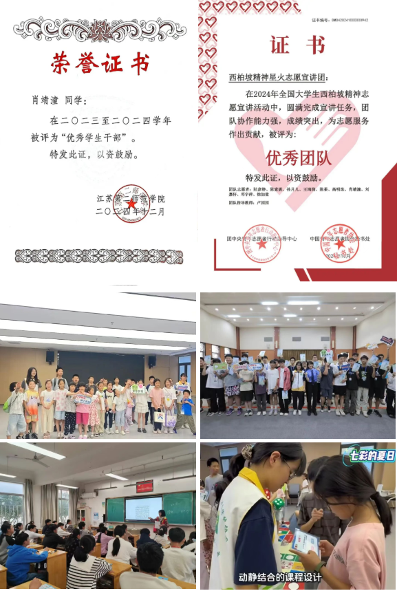 肖靖潼始终秉持“在服务中成长,在实干中担当”的信念,将专业所学付诸实践。在校内,她连续三年投身新媒体工作,累计审核并制作推送50余篇、海报20余张,发布视频20余条,获评“部门工作先进个人”2次及“优秀学生干部”称号。在校外,她连续两年参与家乡“青凤来宜”大学生暑期社会实践,担任宜兴市科技馆展区辅导员、宜兴市博物馆讲解员;策划组织“观革命影片,忆革命先烈”“红色文化走进书法课堂”等主题活动,所在团队获评“2024年全国大学生西柏坡精神志愿宣讲优秀团队”。此外,她勇于尝试多元角色,曾在宜兴市人民检察院担任实习检察官助理,积极参与“法治飞行棋”普法宣传活动,并运用心理健康教育知识,在实习学校为学生开展“认知行为疗法”主题辅导,帮助缓解考试焦虑,以实际行动践行师范生的责任与温度。