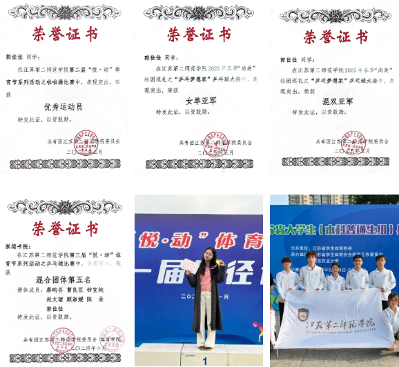 除了学科竞赛,郭佳佳还积极参加各项体育竞赛。作为校乒乓球队主力队员,她代表学校参加了2025年江苏省大学生乒乓球锦标赛,展现了二师优异的体育教育成果。在校乒乓球比赛中,包揽女单、混双、团体金银铜牌,体现出崇德书院更高、更快、更强、更团结的体育精神和风采。