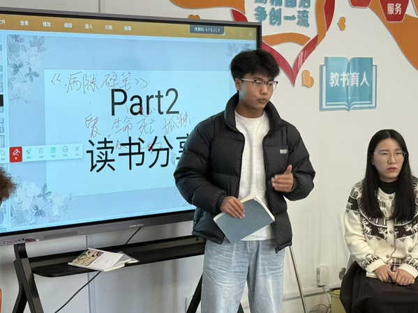 经典如镜,照见文学之美。鲁宇阳同学畅谈心仪作家,赞王小波在《黄金时代》中以诙谐笔触书写文革岁月里富有生命力的女性形象,其文字如利刃刺破伪善;叹马尔克斯《百年孤独》等作品的结尾,总能以激昂震撼的力量成为全篇高潮,尽显文学魅力。周睿涵分享《病隙碎笔》,从初识史铁生文字的悲伤,到读懂字里行间的生命韧性,那些关于死亡、孤独、爱与生命的思考,让大家明白“人生如四季,衰败亦是常态”,从而不再畏惧离别与消亡。