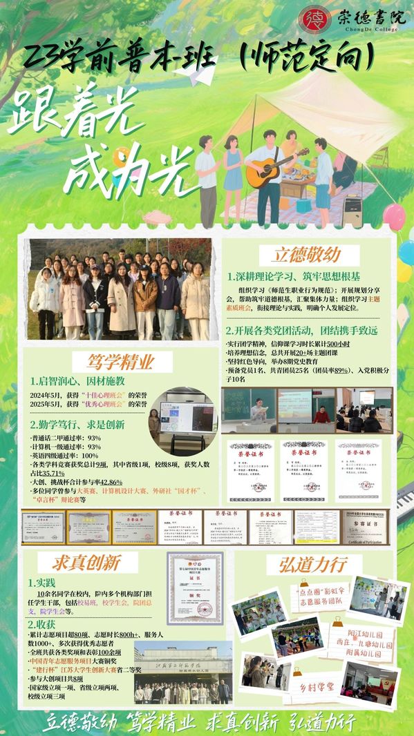 一份荣誉,一份肯定,更是一份激励。23学前定向班与24小教未来教师班的双双获奖,不仅是两个班级的荣光,更是崇德书院优良学风建设与育人成果的生动彰显。从备赛时的凝心聚力、精益求精,到赛场中的风采绽放、从容自信,两个班级用实际行动诠释了何为“团结就是力量”,何为“初心不负韶华”。
