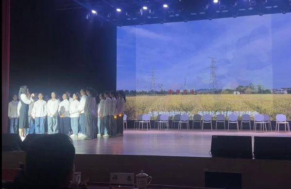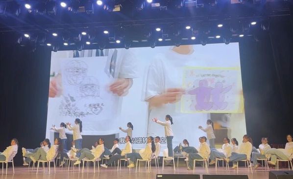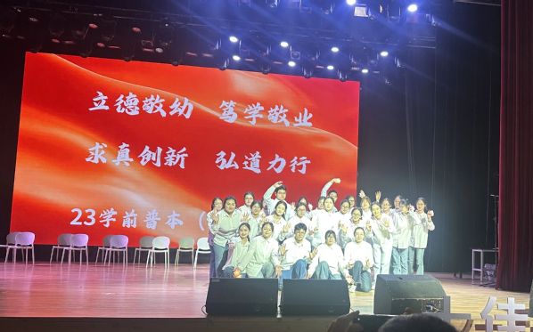 风采展示环节,班级结合学前专业特色,敲定椅子舞《奔赴山海》作为展示节目。面对课程繁忙、道具配合难度大等挑战,同学们利用晚间、周末等课余时间集中排练,从队形设计、动作衔接到情感表达,反复打磨优化。排练中,大家相互指导纠正、彼此鼓励打气,将对乡村儿童的牵挂与教育初心融入每一个舞姿。舞台上,椅子的起落与音乐节奏精准契合,队形变换流畅自然,当幼儿园孩子们稚嫩清脆的呼唤声响起,真挚动人的画面赢得了现场持久而热烈的掌声,也让他们成功跻身十佳行列。