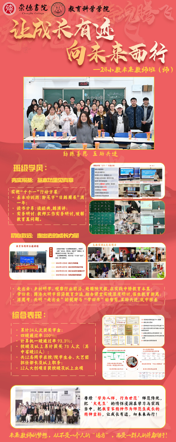 未来,愿两个班级以此次荣誉为新起点,继续秉持教育初心,深耕专业学习,强化实践能力,在基础教育的广阔天地中勇毅前行。也期待崇德书院全体学子以他们为榜样,凝心聚力、笃行致远,在成长路上书写更多精彩篇章,为教育事业发展贡献青春力量!