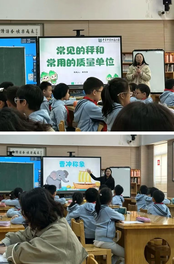 在课例展示环节,南京市金陵中学实验小学孙晨老师与中华附小姜桂梅老师,依托《曹冲称象》这一经典文本,分别执教了“称量大象质量”与“现代秤家族”两节跨学科融合课。两位教师借助实物教具与小组合作探究模式,引导学生在具身实践中建构数学概念,生动诠释了跨学科主题学习的实施路径。