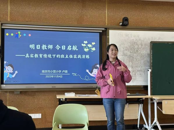 为强化师范生班级管理与德育工作能力,12月10日,教发中心特邀江苏省班主任大赛一等奖获得者、南京市小营小学卢婧老师团队,为2023级小学教育(普本)班开展了“真实教育情境下的班主任实战演练”专题培训。