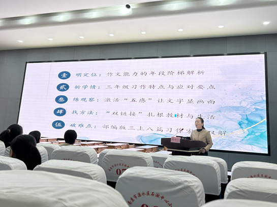 活动现场,石湫中心小学的骨干教师展示了《我来编童话》习作示范课。授课教师通过创设趣味化教学情境,巧妙引导学生发散思维,有效激发了儿童的文学创作潜能。观摩过程中,师范生重点考察了教师的课堂调控艺术与学情反馈机制。随后,简中兰老师作了题为《如何开展小学习作课》的专题讲座。她结合具体课例,深入浅出地剖析了习作教学的导入技巧与指导策略,讲座互动频繁、启发性强,极大地丰富了师范生的专业知识储备,为后续开展习作教学实践提供了可操作的路径指引。
