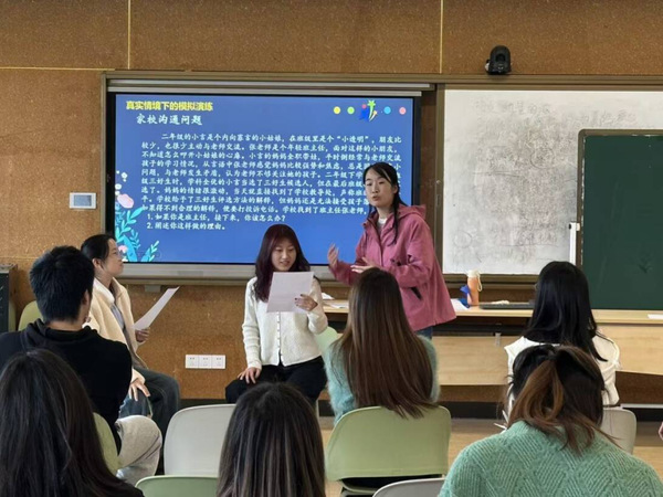 本次培训采用“情境模拟+策略指导”的沉浸式教学法。卢婧老师选取一线教育典型案例,聚焦青春期心理引导、特殊学生家校沟通等难点问题,组织师范生分组进行角色扮演。通过还原真实的冲突场景,师范生在实操中深刻体悟了班主任工作的复杂性。卢老师在点评中传授了“先处理情绪,再处理事情”的沟通黄金法则,并细致讲解了与不同类型家长互动的策略。此外,她还推荐了《班主任专业基本功》等专业书目,为师范生的持续学习提供了资源支持。此次演练有效打通了德育理论与班务实践的壁垒,增强了准教师们的职业胜任力。