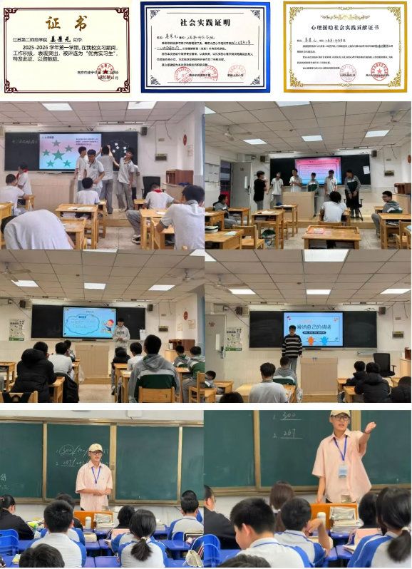“纸上得来终觉浅,绝知此事要躬行。”姜景元始终坚持将课堂所学转化为实践能力,在各类教学与社会服务实践中锤炼师范本领。在南京市建宁中学实习期间,他结合中学生心理发展特点,独立设计10节针对性心育课程,完成40课时授课任务,以生动的教学形式、专业的心理引导获得师生一致认可,获评“优秀实习生”;在溧水区第一初级中学见习时,他以“副班主任”身份深度参与班级管理,运用认知行为疗法、共情沟通等专业知识妥善处理学生人际矛盾、学业焦虑等问题,因表现突出获校长点名表扬。此外,他还主动将专业服务延伸至社会各界,在石湫司法所、幕府山庄小学、社会儿童福利院等地开展心理援助活动,为江西吉安学子提供心理健康云支教,参与暑期“三下乡”社会实践数十场,多次获评社会实践“先进个人”,真正实现了从理论学习者到实践赋能者的蜕变。