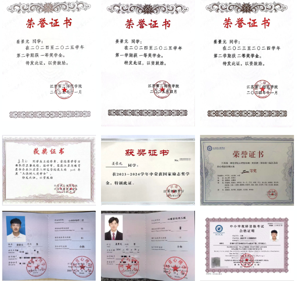 他秉持“勤学、善思、笃行”的学习理念,始终保持对专业知识的敬畏与钻研精神,综测成绩长期稳居专业第一,先后斩获校长奖学金、立德树人奖学金、校一等奖学金等多项荣誉,用优异成绩印证“学高为师”的追求。为夯实专业技能,他系统学习心理咨询核心理论与实操方法,先后顺利考取江苏省三级、二级心理咨询师证书,熟练掌握心理评估、团体辅导、个体咨询等专业技能,为今后从事心理健康教育工作奠定了坚实基础。